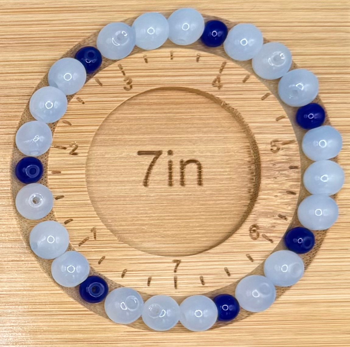 This elegant handmade bracelet features soft light-blue beads paired with deep navy accent beads, creating a calm and timeless color combination. The minimalist design makes it perfect for everyday wear or layering with other bracelets.