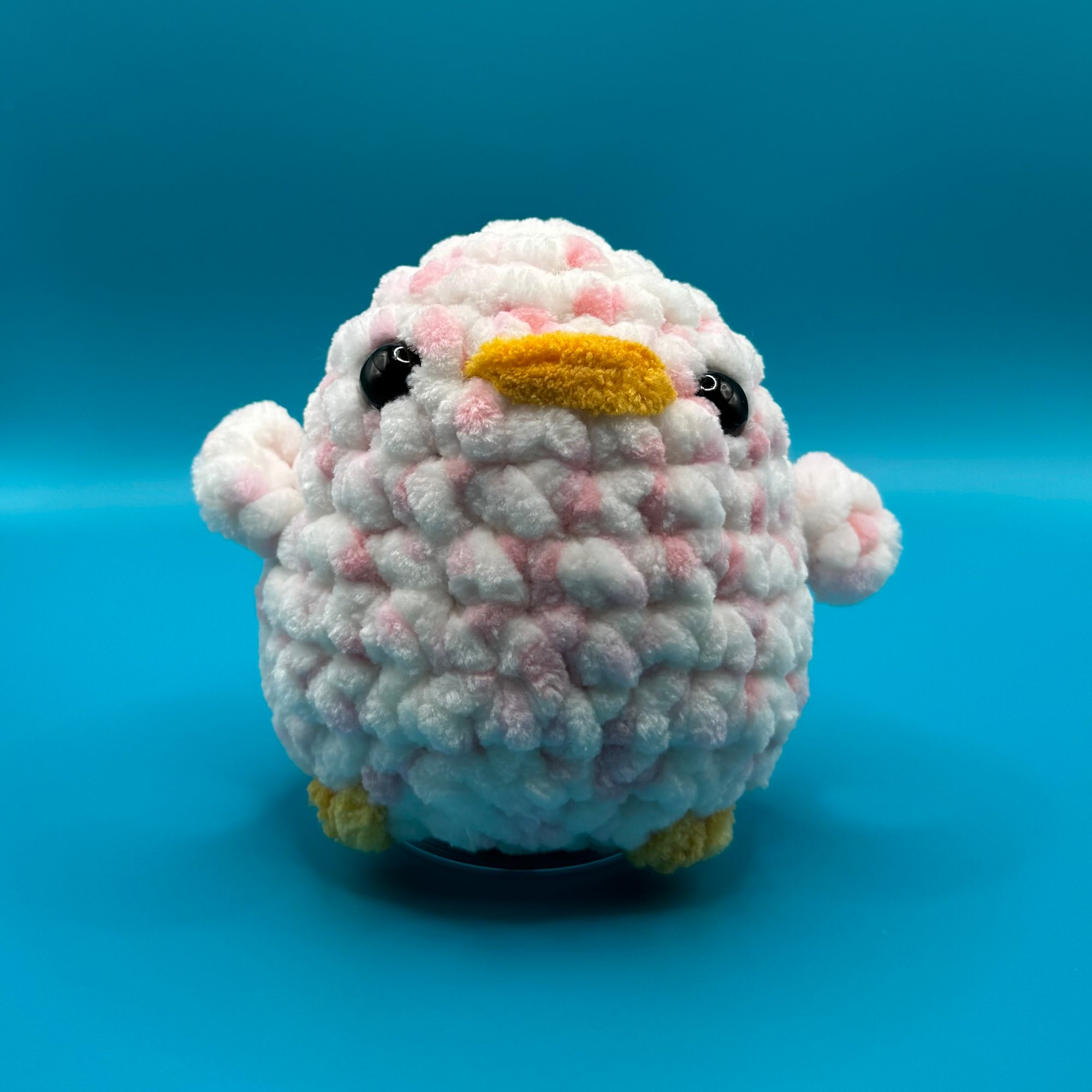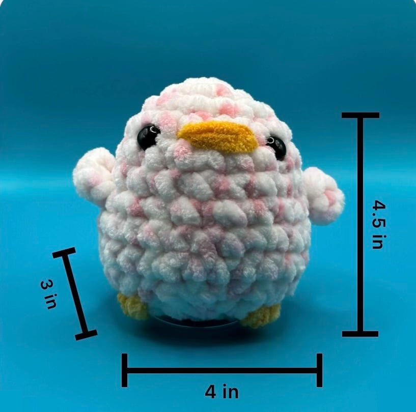 This handmade crochet duck plush is soft, round, and irresistibly adorable. Measuring approximately 4.5 inches tall, this duck fits perfectly in the palm of your hand, making it an ideal gift or decorative accent.